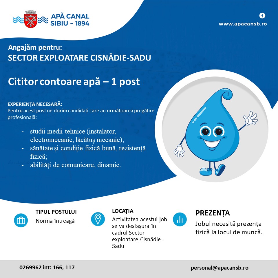 Cererile tip de participare la concurs se completează și se depun online la adresa de email: personal@apacansb.ro sau la sediul societăţii din Sibiu, str. Eschil nr. 6, Serviciul Resurse Umane împreună cu CV, copie diplomă/acte studii şi adeverinţă medicală de la medicul de familie, până la data de 07.11.2025.