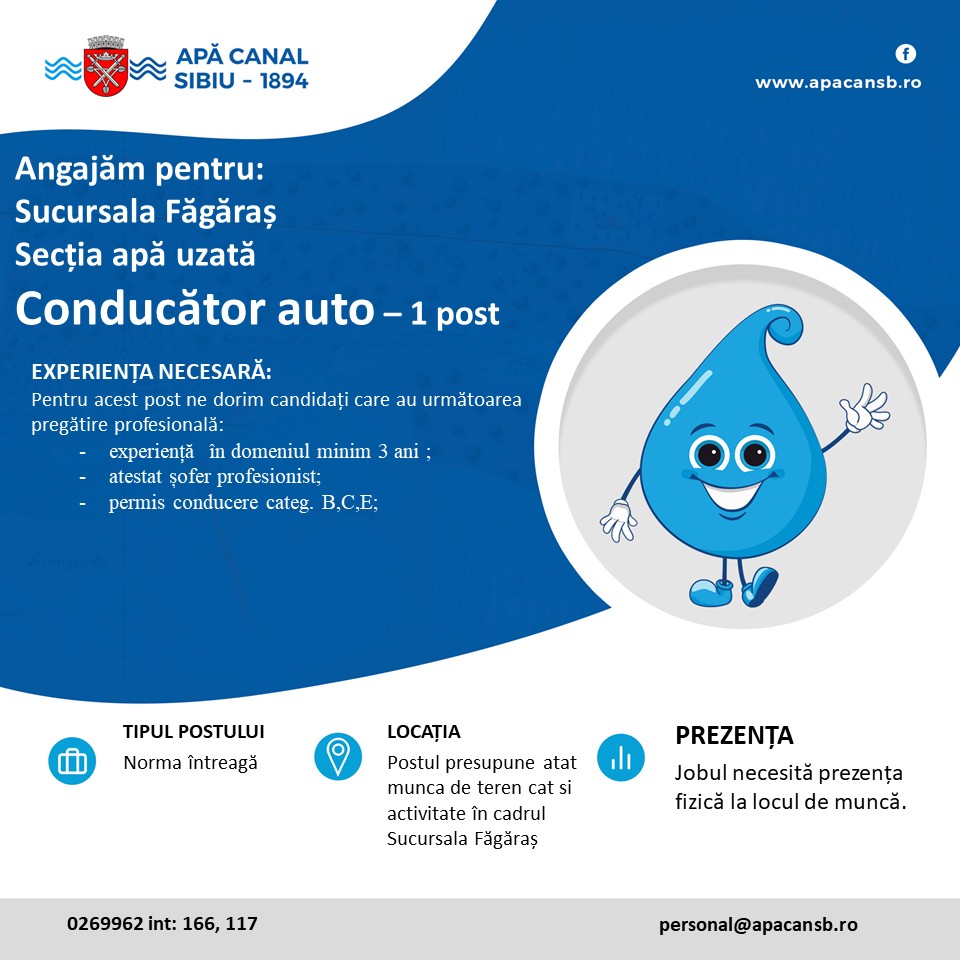 Cererea tip de înscriere la concurs (se regasește pe site-ul societății) se completează și se depune online la adresa de mail: personal@apacansb.ro sau la sediul societăţii, str. Eschil nr. 6, Serviciul Resurse Umane, împreună cu CV, copie diplomă/acte studii şi adeverinţa medicală de la medicul de familie, până la data de 17.10.2025. Relaţii suplimentare la tel: 0269962 (int: 117 sau 166).