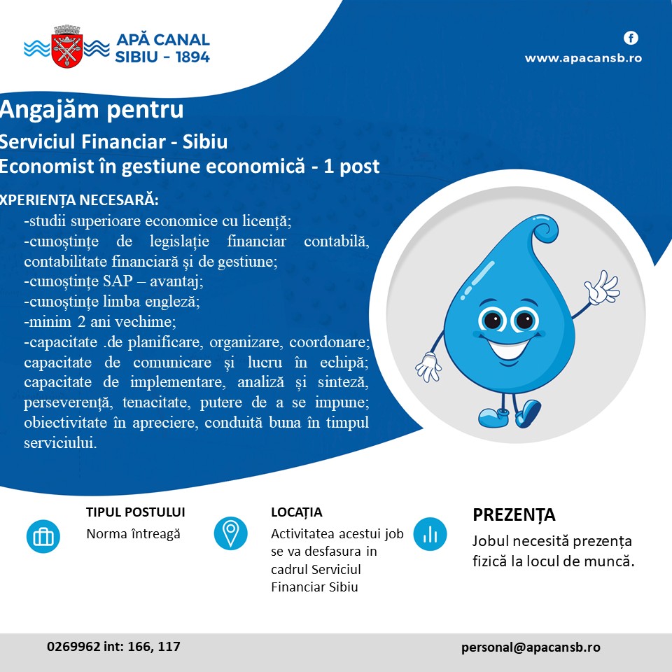 Cererile tip de participare la concurs se completează și se depun online la adresa de email: personal@apacansb.ro sau la sediul societăţii, str. Eschile nr. 6, Serviciu Resurse Umane, împreună cu CV, copie diplomă/acte studii şi adeverinţa medicală de la medicul de familie, până la data de 16.03.2026.