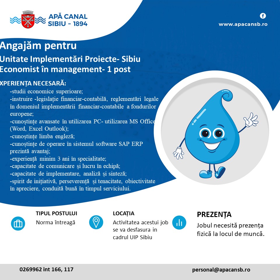 Cererile tip de participare la concurs se completează și se depun online la adresa de email: personal@apacansb.ro sau la sediul societăţii, str. Eschile nr. 6, Serviciu Resurse Umane, împreună cu CV, copie diplomă/acte studii şi adeverinţa medicală de la medicul de familie, până la data de 13.04.2026.