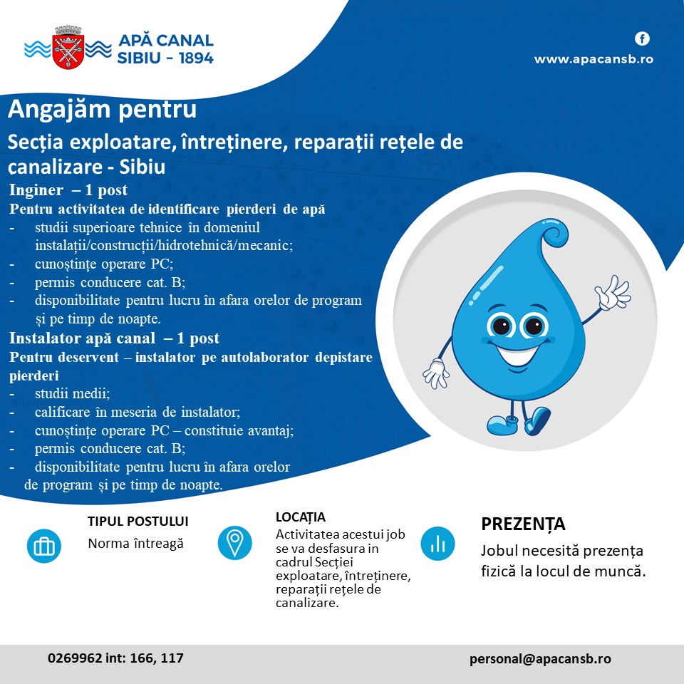 Cererea tip de înscriere la concurs (se regasește pe site-ul societății) se completează și se depune online la adresa de mail: personal@apacansb.ro sau la sediul societăţii, str. Eschil nr. 6, Serviciul Resurse Umane, împreună cu CV, copie diplomă/acte studii şi adeverinţa medicală de la medicul de familie, până la data de 17.10.2025. Relaţii suplimentare la tel: 0269962 (int: 117 sau 166).