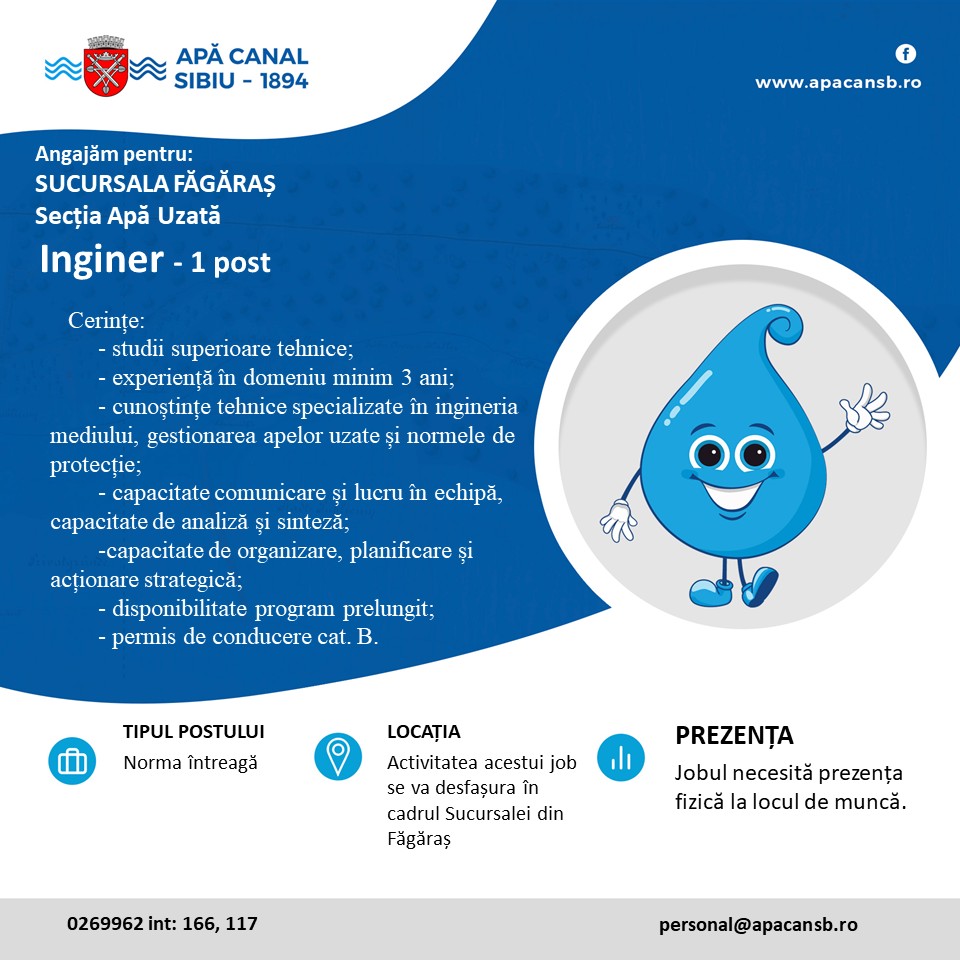 Cererile tip de participare la concurs se completează și se depun online la adresa de email: personal@apacansb.ro, la sediul societăţii din Sibiu, str. Eschil nr. 6 – Serviciul Resurse Umane sau la sediul Sucursalei din Făgăraș, împreună cu CV, copie diplomă/acte studii şi adeverinţa medicală de la medicul de familie, până la data de 10.11.2025.