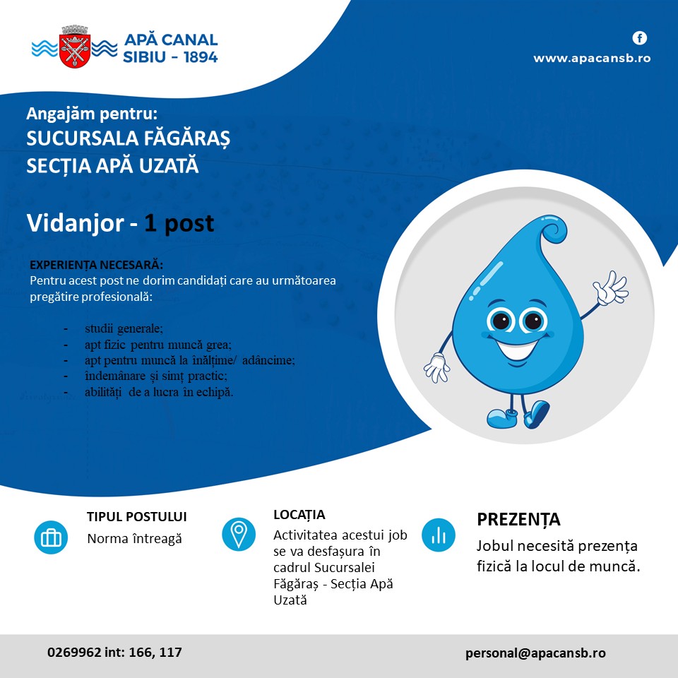 Cererile tip de participare la concurs se completează și se depun online la adresa de email: personal@apacansb.ro, la sediul societăţii din Sibiu, str. Eschil nr. 6 – Serviciul Resurse Umane sau la sediul Sucursalei din Făgăraș, împreună cu CV, copie diplomă/acte studii şi adeverinţa medicală de la medicul de familie, până la data de 10.11.2025.